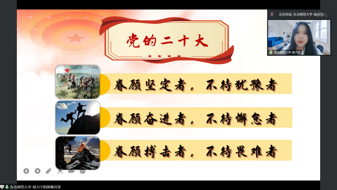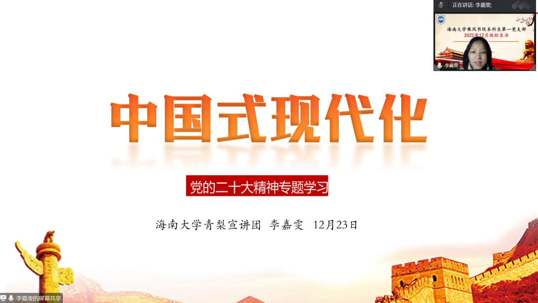 本次会议邀请了东北师范大学宣讲团进行主题为《答好新时代青春之问》的联学宣讲,号召全体党员在实践中回答好“三问”。随后,永利官网“青梨”宣讲团成员李嘉雯带领大家持续学习党的二十大精神,对中国式现代化进行深入学习。最后,由支部党员王文克交流分享在本次组织生活会的学习过程中的经验和体会。