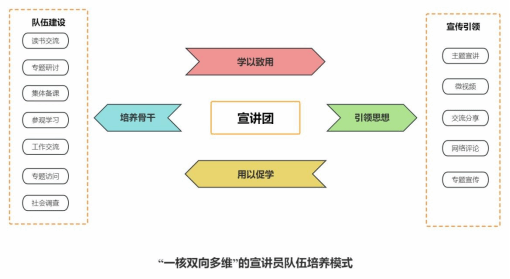 经过5年的实践,宣讲团形成了“一核双向多维”宣讲队伍培养模式,主要包括:“一核”指打造一支核心队伍,即建设好“信仰·青年说”宣讲团,发挥他们在深入学习习近平总书记系列重要讲话精神,实现在理论学习与思想引领方面的先学一步、先行一程;“双向”指注重对内队伍建设与对外宣传引领的齐抓并举,实现自我成长与朋辈指导的双向并重,在学以致用和用以促学的过程中实现学用相长,知行合一,实现培养骨干、引领思想的双重双向效果;“多维”指通过读书交流、专题研讨、集体备课、参观学习、工作交流、专题访问、社会调查等活动和主题宣讲、微视频、交流分享、网络评论、专题宣传等形式,加强队伍建设,开展思想引领,不断提升队伍的政治性、先进性和影响力、感召力。